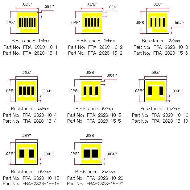Features: High reliability TaN thin film resistors, low stray capacitance, good solder-ability and wire-bonding, temperature coefficient: 150 ppm/oC , operating temperature: -55 oC - +200oC.